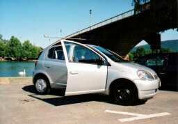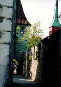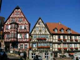 来る嬉しさと少々疲れを感じることから、早めの就寝。 走行距離:565km(By car) ホテル:EU40 ニュル走行費:EU12 食費:約EU12 地図:EU11.5 <7月 8日> 時差ボケを感じることなく、6時過ぎに起床、体調も天候も問題なし。朝食時には同じ宿に泊ってい た人達とワールドカップの話をしながら。楽しいけど、自分の語学力のなさを思い知らされる瞬間、も っとがんばらないとね。 8:30頃に宿を出て、昨日見損ねたミルテンブルクへ。 マインの真珠と呼ばれ、日本人には知られていないが、ドイツ人には人気の街並みらしい。良かっ た、今日は祭りの余韻もなさそう。駐車場に車を停め、さあ行こうと思ってる所に何か漏れるような 音。見てみると自分のヤリスのタイヤがぺちゃんこになってる! あまり時間もなかったので、さっさと タイヤ交換して、残り少ない時間で、少しだけ散策を楽しむ。派手ではなく、いまだに人々が生活し ている中世の街並みは、美しくかつリアリティに満ちている。