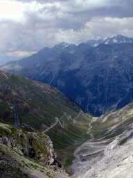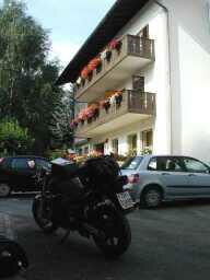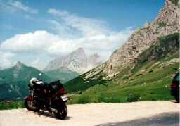 峠を目指す。標高が上がるにつれ、気 温が下がっていくのが肌で感じられ、 タイトな区間が増えてくる。木々の間か らは、氷河を湛えた岩山が見え隠れ し、アルプスを実感する。道の荒れが スイスよりは若干気になりだす頃に は、明らかに森林限界を超えたよう で、低木が目立ち、一気に見通しが良 くなる。コーナーのほとんどは180°タ ーンになるが、多くはガードレールも、 センターラインもない。ペースを崩すこ となく、集中力を維持しながら、ワイン ディングを楽しむ。充実感で満腹にな る頃に峠に到着、地元ライダーも多数 休憩していた。 やっぱりイタリアに来たのだからと峠 のカフェにて、カプチーノで一休み。イタ リアは特にコーヒーが美味しい。この 時点で16時過ぎなので、峠を下りて宿 探しを始めることにする。しかし、ここからの下りが曲者で、来たルートより、さらにタイトで道も荒れ たターンが続く。いったん対向車線(もちろんセンターラインなんて無いが)に振ってからでないと曲が れないコーナーは、地元組に続いて同じラインをトレースすることを心がける。地元組の多くは、 ここをタンデムで抜けるのだから舌を巻く。こちらは、扱いやすいバイクであったことに胸を撫で下ろ す、無理は禁物だ。 峠を下りI38をそのまま東へ進路を変える。周りはブドウなどの果物畑が広がり、各所で散水してい る。小さな村ラースで国道を離れ、村の中へ。どんな小さな村でも、大抵は宿があるもので、小さな 村であればあるほど安くなる傾向がある。特に田舎の民宿では、部屋の広さと綺麗さは保障されて いるようなもので、しかも見つけるのも容易であるから使わない手は無い。今日の宿は、EU33のペ ンションに決定。バイクはシャッター付きの納屋に入れてもらえたので、盗難の心配もなし。近くのレ ストランで、当然のようにピザで夕食の後、近くに見つけたので、デザートはジェラートを頂いて、今 日の食生活は、イタリア満喫。部屋でシャワーを浴び、ようやく暗くなった10時過ぎにベッドに入る。 初日にしてツーリングを満喫の一日だった。 <本日のデータ> 走行距離:478km(By Motorcycle) ホテル:EU33 ガソリン代:SF20 食費:EU9+SF17 <7月 10日> 6時頃起床し、すぐにカーテンを開けて空を見る。良かった、今日も真っ青な空が広がっている。今日 は、今回のツーリングの主目的地、ドロミテ山塊周辺を目指す。朝食を頂いて、8:30頃に出発、I38を 東進する。今日からWeekday、生活感が漂う一般車が多くなる。それでも極端に流れが遅くなること もなく、メラーノから自然にアウトストラーダに入る。やはりそれほどドイツやスイスと違いがないの は、イタリアでも北の端だからだろうか。ボルツァーノまでの短い道のりを、アウトストラーダで走り、 再び峠へとバイクを進ませる。ボルツァーノは、わりと大きな町で、市街部で少し迷うが、ツーリング 集団の後ろについて行くことにする。この辺りを走ってるんだから、目的地も同じだろうからね。無事 I241に入ることが出来た。