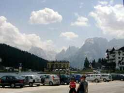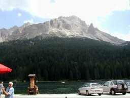 に入るあたりで給油を行う。日本でも最近は多くなってきたセルフ式のスタンドがほとんどで、自分で 給油後にレジで支払うのだが、このまま逃げちゃったらどうなのかな? といつも不穏当な事を考えて しまう。もちろんちゃんと支払うし、同時にトイレを借りたり水を買ったりもする。特別に難しくもない給 油だが、一つ気をつけたのが、ガソリンの種類で、各国の言葉で書かれていてもさっぱり分からない のである。しかし、国際規格であるオクタン価に注目して、「95」の数字が書いてあるノズルを使うこ とにしていた。おそらく日本で言うレギュラー相当だと思うが、Go&Stopが少なく、巡航区間が長い ことから、それほど神経質にならずともノッキング等は起こさなかった。 I48に入ると、景色は一変、まさに山塊というべき岩の塊のような山がそそり立っている。険しくしか し美しいスイスアルプスとは異なった、人の介在を拒むような山塊と、麓に散見する美しい湖の対比 は、真っ青な空と相まって、何とも美しい。これまでの峠道よりは幾分ペースを落として、周囲の景 色を楽しみながら走ることに専念するが、あまりに雄大な風景に飲み込まれそうな感覚さえ味わう。 そのうち、ドロミテ観光のベースとして有名なコルティナダンベツィーノに到着、山岳観光地らしく、そ こかしこにロッジ風ホテルが見られる。村内の通行に少し気を使いながらパスし、ミズリーナへ。小さ いながらも美しい水を湛える小さな湖の湖畔のカフェで一休み。ここらで標高は1200mほどか? サ ンドイッチとカプチーノで昼食を済ませる。 昼食後は後ろ髪を引かれながらドロミテを後にし、I49を東進しオーストリアへ国境超え。このボーダ ーは、建物らしきはあるものの、まったく人が居る気配がないので、そのままパスする。ここまで大分 標高を落としてきたものの、A111ドロミテ街道に入って、また少し標高を上げる。しかし、ドロミテとは 言ってもこれまでとは景色が一変、険しい丘と言うべきか、なだらかな山と言うべきか、映画Sound of Musicの世界を走る。コーナーの深さも稜線に沿った大きなRが続くので、自然とペースが上が る。次はA100を北上、再び標高を落としてくると、日差しの強さが気になりだす。スーパーで一休み するも、日向は体力を消耗するので、日陰でレッドブルを一気飲みする。やはりヨーロッパと言えど夏 を実感する。