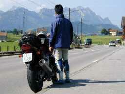 トバーンに乗り、一路フランクフルトへ。さすがに90km/h程度の速度での巡航は少々気を使うもの の、トラックやバスの流れと同調して走らせる。 フランクフルトで車を返し、チェックイン後空港で昼食。フランクフルト空港のマクドナルドは、見晴らし が良く、離着陸を眺めながら食事できるのでお勧めできる。 チューリッヒへは、スイス航空のプロペラ機で。実質45分程度のフライトながら、軽食も果物も配られ るしで、サービスは満点だ。本当に、あっという間にチューリッヒに到着。空港税関でヘルメットを持っ てることが分かると、税関職員は「おれはSUZUKIの1300に乗ってるぜ」と声をかけてくる。やはりヘ ルメットを持った旅行者は珍しいらしい。 今回のレンタルバイク店が迎えに来てくれるというので、到着ロビーで探してみるが、それらしい人 は居ない。30分ほど待つがいっこうに現れないので、店にTELしてみると、「明日じゃなかったっ け? 今空港かい? すぐに迎えに行くよ」と店主のフィルストさん。のん気だなあ、さすがヨーロッパ、 と感心しながら待つこと20分、フィルストさんが現れた。非常に親しみやすい人柄で、ホテルまで送 ってもらう間、ずっと話を楽しむ。 ホテルにチェックイン後、チューリッヒ市街地散策に。さすが大都市、人並みと繁華街に少々戸惑っ てしまう。やはり小さな街が、僕には合ってるのかもしれない。今回のホテルは、市街地からバスで 20分くらいの郊外にあるのだが、市街中心のホテルでは、チェックインする日本人ツアーの姿も。四 ツ星クラスのようで、やはりツアーでは、高級ホテルを利用しているようだ。夕食を済ませ、ホテルに 戻って、明日からのツーリングに備えて荷物の下準備をする。明日からいよいよツーリング開始、期 待を胸に就寝する。 走行距離:271km(By car) レンタカー:EU145(保険等含) ホテル:SF110 ガソリン代:EU36 食費:EU5+SF12 <7月 9日> ヨーロッパのほとんどのホテル、宿は朝食込みなのがありがたい。オレンジジュースに始まり、数種類のパン、ハム、チーズがメイン、そして各種シ リアルとミルク。果物やヨーグルトも用意されているところが多く、朝からし っかり栄養補給でき、しかも美味しいのだから言うことない。コーヒーが美 味しいのも好きな理由だ。 ライディング用に着替えて、皮パンツを履いたままチェックアウト、ホテルの前 のバイク店へ向かう。店ではフィルスト さんと整備万端のZR-7が待ち構えてい た。簡単な手続きを終え、ツーリング用 の荷物を積み込み、スーツケースを店 に預けて、いざ出発。 最初に目指したのは、ラインの滝。落差 のある滝を見慣れた目には新鮮で、そ の圧倒的水量が流れ落ちる様は圧巻である。昔から物流に寄与 してきたライン川も、ここだけは避けて通らねばならない。 ラインの滝からは、今回のメインの目的地、アルプスの峠超えのために、サンモリッツを目指す。高 速道路はドイツ同様快適だが、慣れないノンカウルのために、思ったほどペースが上がらず130km/ h前後で、周囲の車の流れに合わせて巡航する。途中、ハイジの里として知られるマイエンフェルト のS.A.で昼食をとり、クールで高速を下りる。ここからが本番、山岳道路の様相を呈してくる。それに しても、やはり涼しく皮パンツでもまったく不快感を感じないどころか、フィット感と安全性、耐寒性か らも、最も適したスタイルであることを実感する。